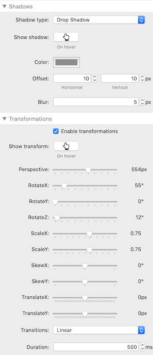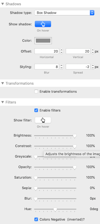 Additionally images can be rotated, scaled, skewed, moved and animated without and Javascript, as well as borders, shadows, rounded corners and porthole (round or oval image).